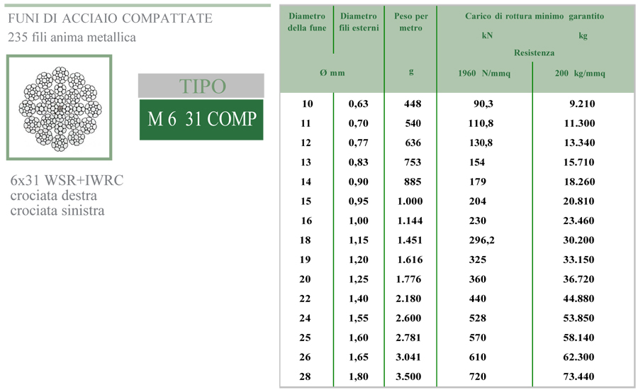 Fune acciaio lucido o zincato 235 fili 6×31 WSR+IWRC trefoli compattati M 6 31 COMP CD-CS – R. 2160 N/mm²