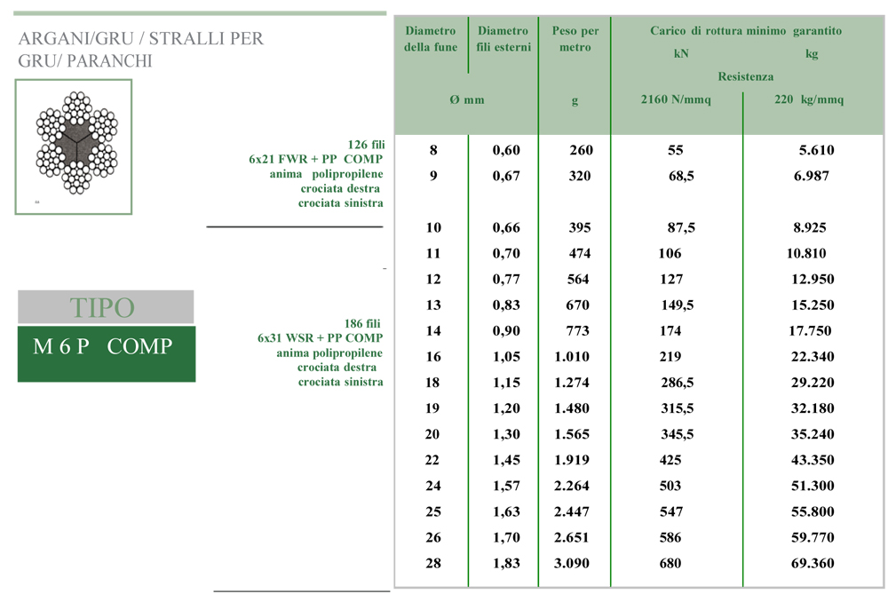 Fune acciaio lucido o zincato 126 fili 6×21 FWR+PP anima polipropilene trefoli compattati M 6 P COMP CD-CS – R. 2160 N/mm²