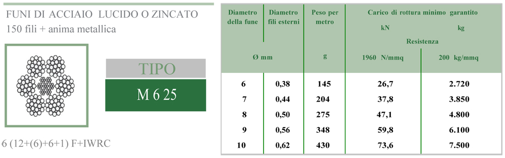 Fune acciaio lucido o zincato 150 fili 6x25F+IWRC 49 fili M 6 25 CD – R. 1960 N/mm² – M 6 25 ECR CD – R. 2160 N/mm²