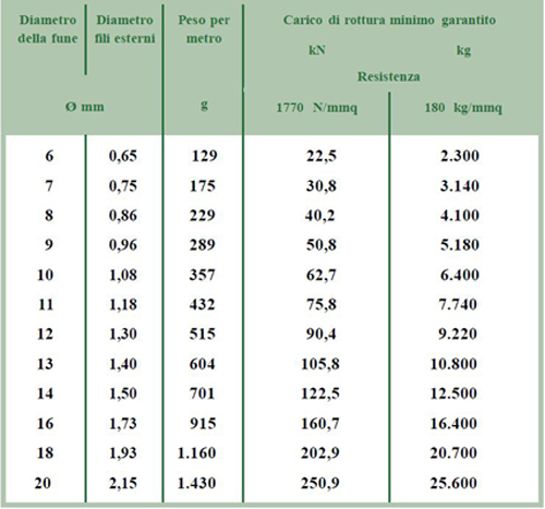 – il carico di rottura dei cavi acciaio espresso in Kg o kN.