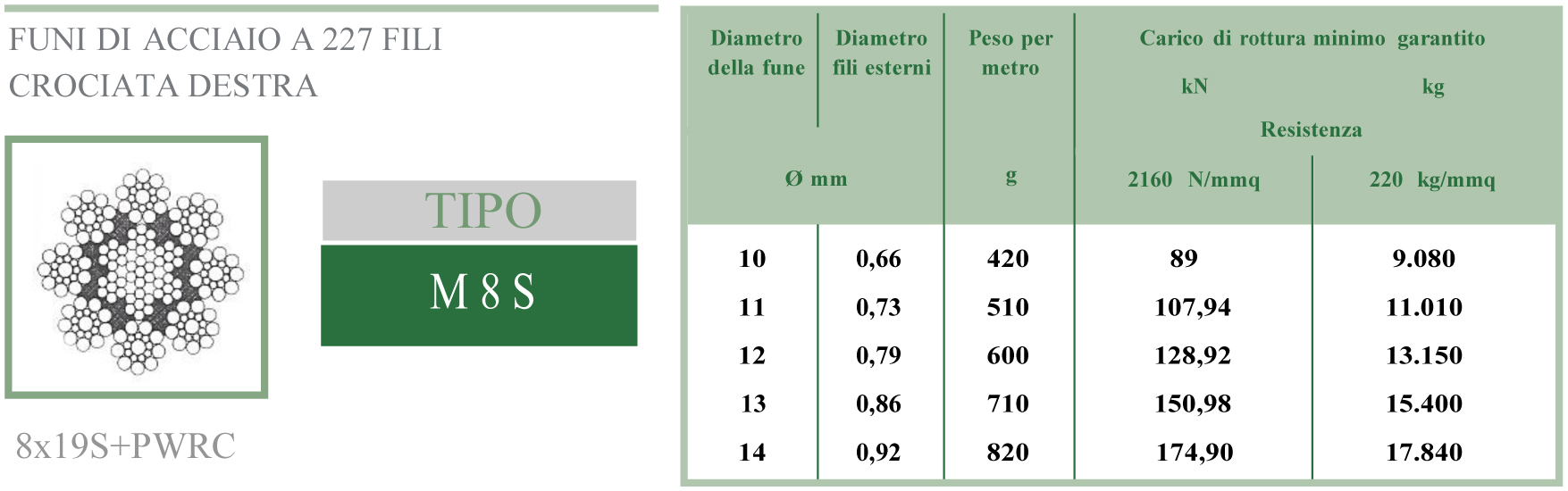 Fune acciaio lucido o zincato 227 fili 8x19S+PWRC M 8 S CD – R. 2160 N/mm²