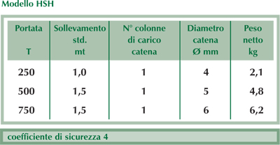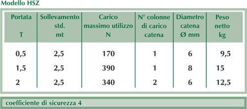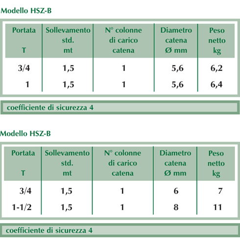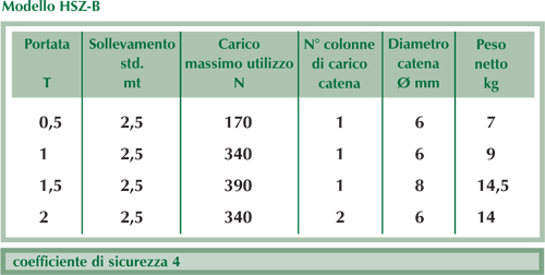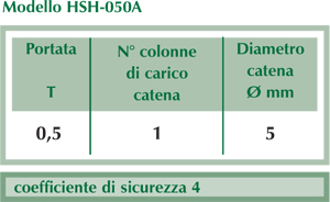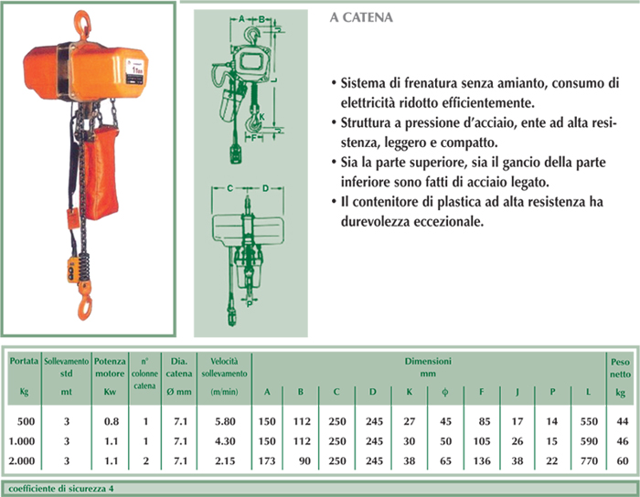 La gamma dei paranchi a catena comprende portate da 500 kg, 1.000 kg, 1.500 kg, 2.000 kg.